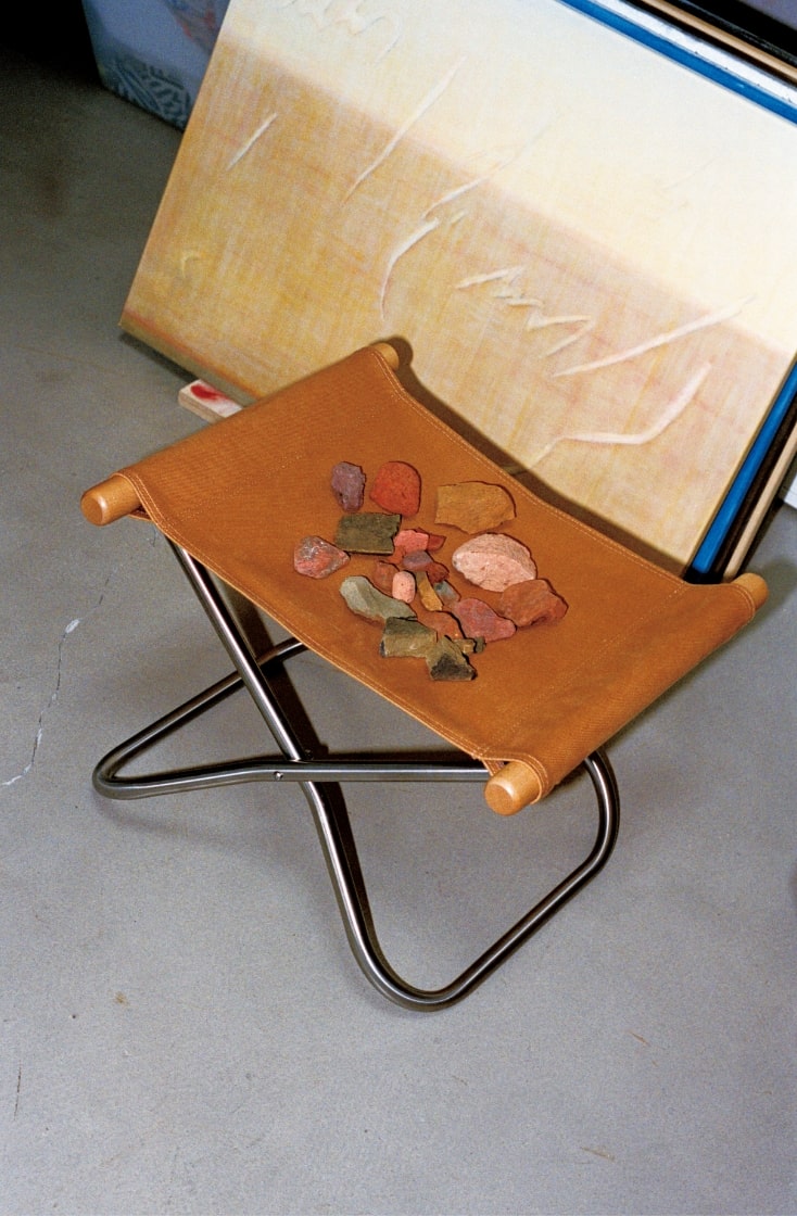 Nychair X Ottoman can also be used as a side table. Before using the stones as pigments, Guðrún temporarily places them here to think about the concept of her paintings.